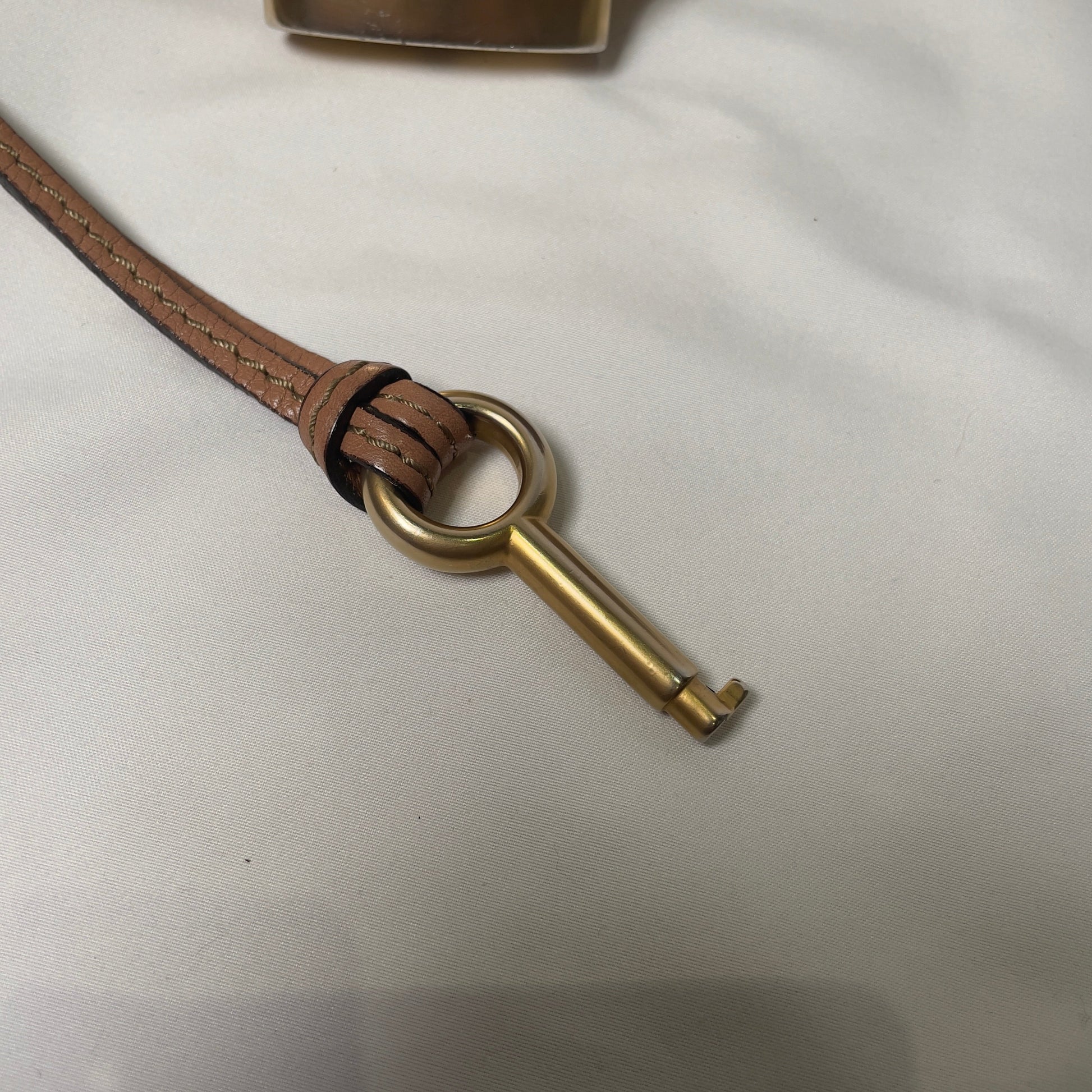 Condition: FAIR-GOOD used condition. Padlock & key fully functional. Leather is soft and supple. Apparent wear to the top coat on all four edges. Underside of handles have discolouration. There is a region on the back panel where some leather points have lifted, circled in photos. Inner lining is clean.