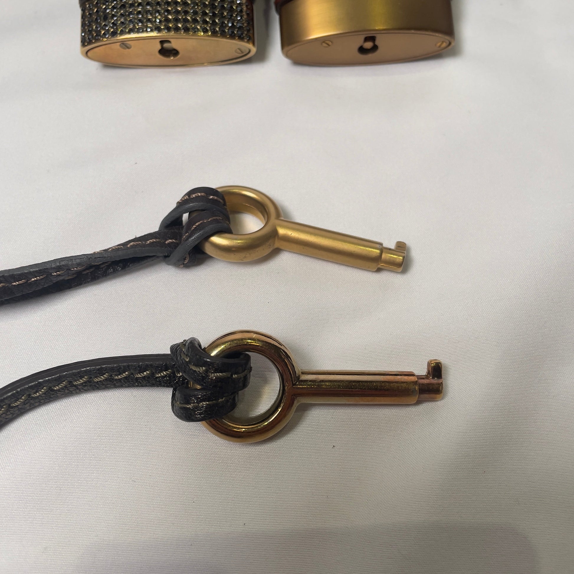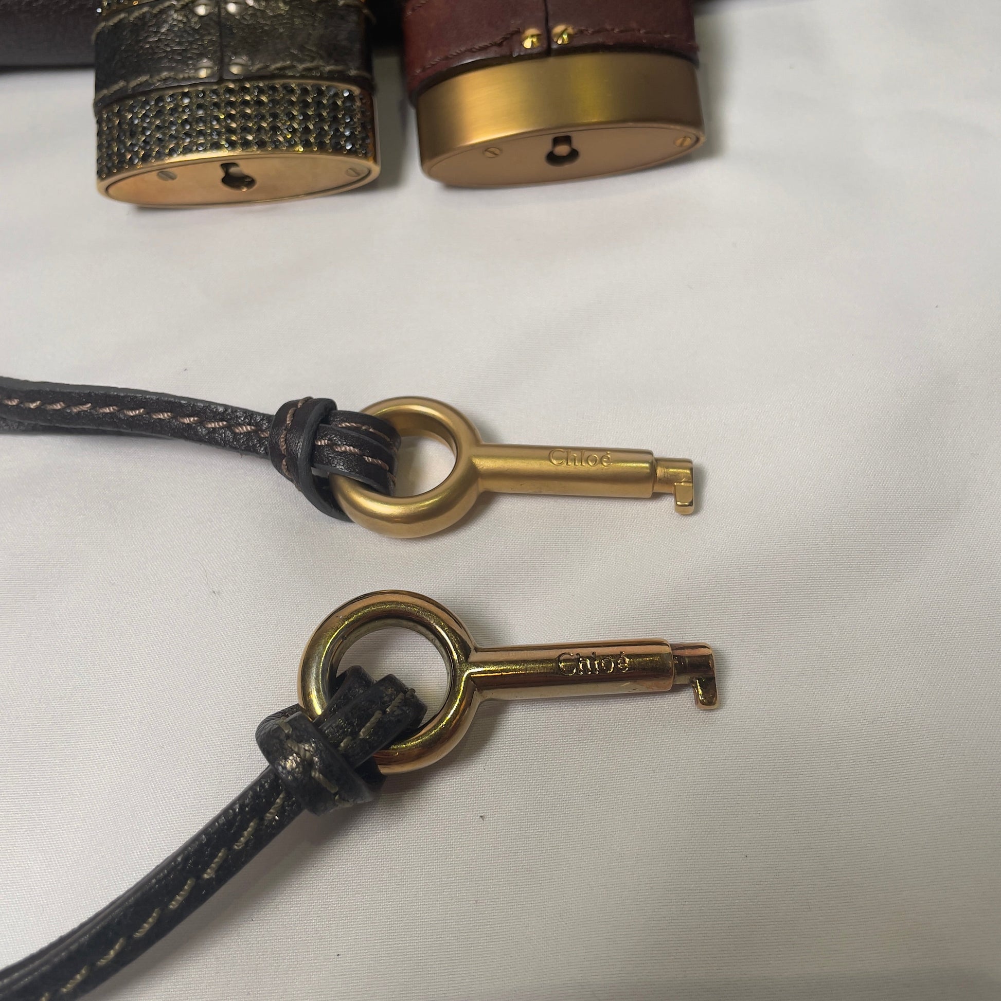 This paddington was sourced with the original key but not the padlock. The bag comes with a spare (genuine) brown padlock in a lighter colour and a Swarovski padlock and key that is a shimmery oil slick colour. Comes with the original sales tag and dust-bag (But no authenticity card.)